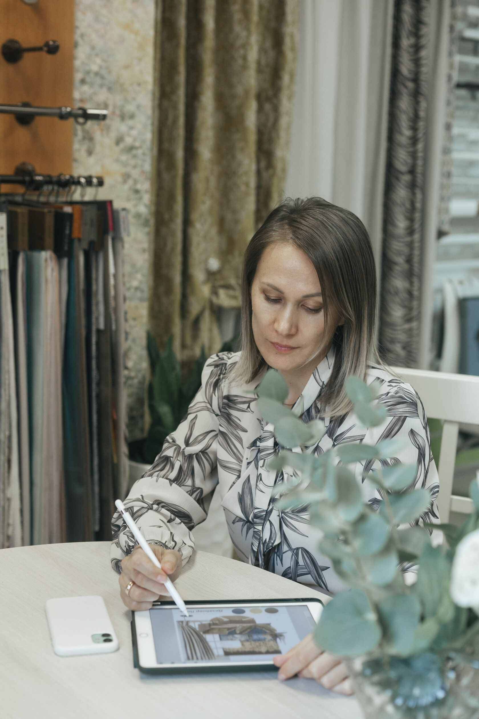 Дизайнер-подберет ткани и сделает замеры Навеска-после того, как шторы отшиты, мы приедем к вам домой, повесим и отпарим изделия